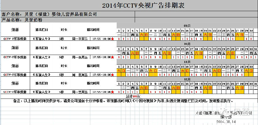 贝登(福建)婴幼儿营养品有限公司创建于1996年,位于福建省莆田市,属外商独资企业。一直专注于高端婴幼儿营养品的研发、生产和经营。于2014年6月5日,顺利通过换证审核工作,取得由福建省食品药品监督管理局颁发的"婴幼儿配方乳粉生产许可证"。 多年来一直感谢新老用户的厚爱,使我们的发展得到了巨大的辉煌。2014我司为迎取新的的征程,回报广大的用户,将于2014年9月至12月在央视黄金时间播放广告,介时各位新老用户注意收看,并请相互转告,以期获得更大的社会宣传效用。 具体播放时间表如下。